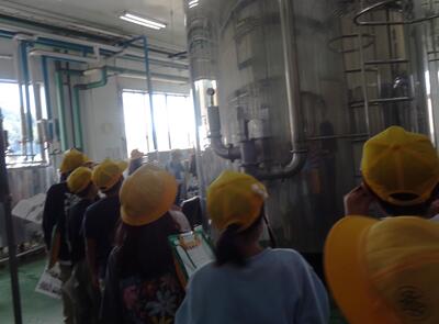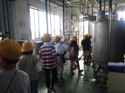 今からおよそ100年前に創業したという歴史ある会社であることや牛乳の生産工程について、資料を用いてお話を聞いた後、実際に様々な設備を見学しました。子どもたちは、運ばれてきた牛乳を貯蔵するタンクの大きさや牛乳パック詰め搬出ラインの規則正しい動きなどに驚きの声を上げていました。
