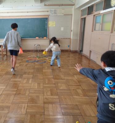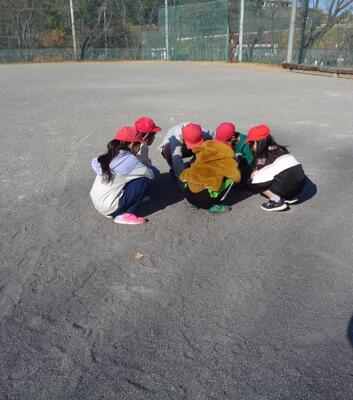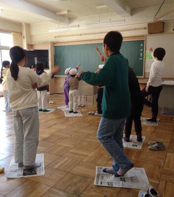 運動場では「だるまさんが転んだ」「王様ドッジ」「フリスビードッジ」「氷鬼」「ドロケイ」など、教室では「けん玉リレー」「ジェスチャーゲーム」「新聞島」など様々な種目に班ごとに取り組みました。25分間、学年を問わずどの子も集中して全力で遊ぶ清々しさが校内に満ちた昼のひと時でした。