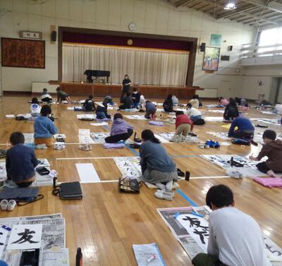 1月15日、3・4年生は体育館で書初め大会を行いました。