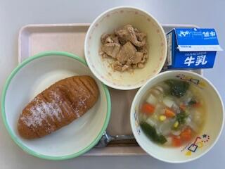 揚げパン(シュガー) 牛乳 鶏肉のバーベキュー風炒め 菜の花入りポトフ
