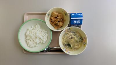 ご飯、牛乳、鶏肉のしょうが炒め、さつまいものみそ汁