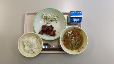揚げパン(きなこ)、牛乳、鶏肉のケチャップ炒め、ABCスープ